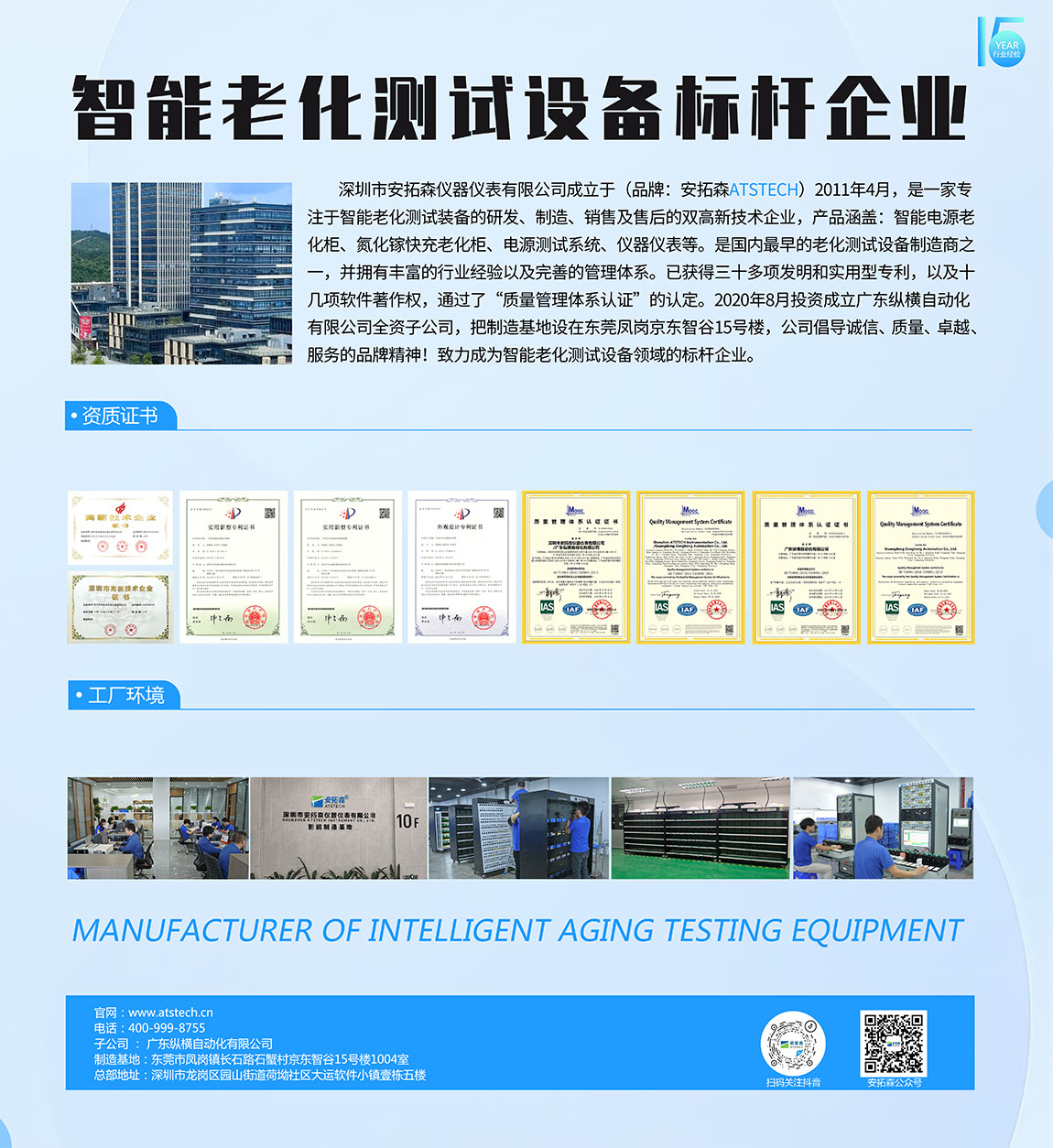 深圳市安拓森仪器仪表有限公司成立于(品牌:安拓森ATSTECH)2011年4月,是一家专注于智能老化测试装备的研发、制造、销售及售后的双高新技术企业,产品涵盖:智能电源老化柜、氮化镓快充老化柜、电源测试系统、仪器仪表等。是国内早一批的老化测试设备制造商之一,并拥有丰富的行业经验以及完善的管理体系。已获得三十多项发明和实用型专利,以及十几项软件著作权,通过了“质量管理体系认证”的认定。2020年8月投资并成立了广东纵横自动化有限公司全资子公司,并把制造基地设在东莞凤岗京东智谷15号楼,公司倡导诚信,质量,卓越,服务的品牌精神!致力于为新老客户提供安全,稳定,快捷,好用的智能老化测试设备。成为智能老化测试设备领域的标杆企业,做为安拓森的企业使命和安拓森人的奋斗目标。