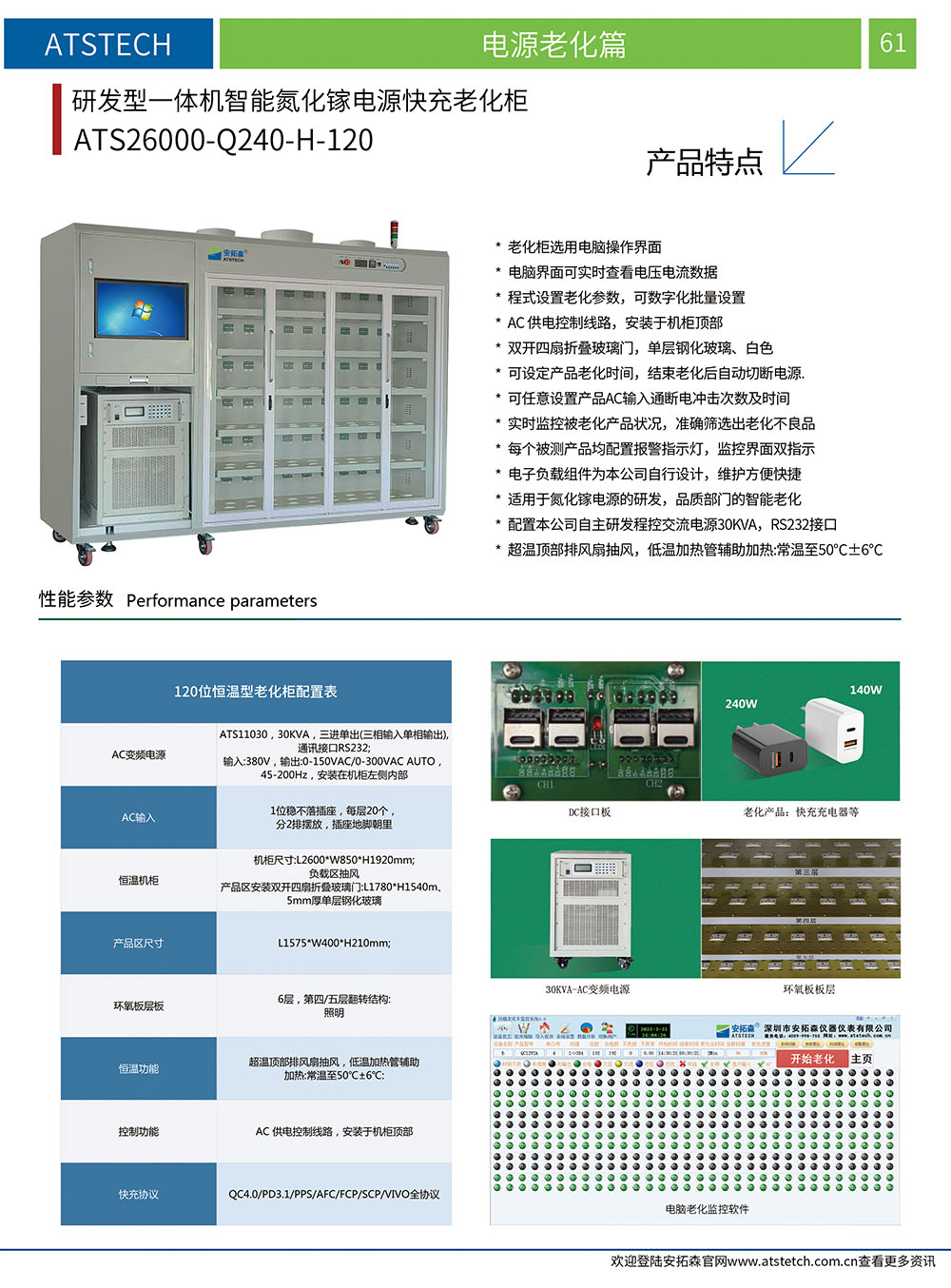 氮化镓是一种新型半导体材料,具有禁带宽度大、热导率高、耐高温、抗辐射、耐酸碱、高强度和高硬度等特性,在早期广泛运用于新能源汽车、轨道交通、智能电网、半导体照明、新一代移动通信,被誉为第三代半导体材料。随着技术突破成本得到控制,目前氮化镓还被广泛运用到消费类电子等领域,充电器便是其中一项。简单的说,氮化镓拥有更宽的带隙,宽带隙也意味着,氮化镓能比硅承受更高的电压,拥有更好的导电能力,相同体积下,采用氮化镓技术的充电器比普通充电器输出效率更高。打个比方说,采用氮化镓材料做出来的充电头,体积和苹果5W充电器差不多大小的情况下,能实现更多的输出功率。氮化镓充电器老化需要专用的GAN氮化镓充电器老化柜,不要用常规老化柜。