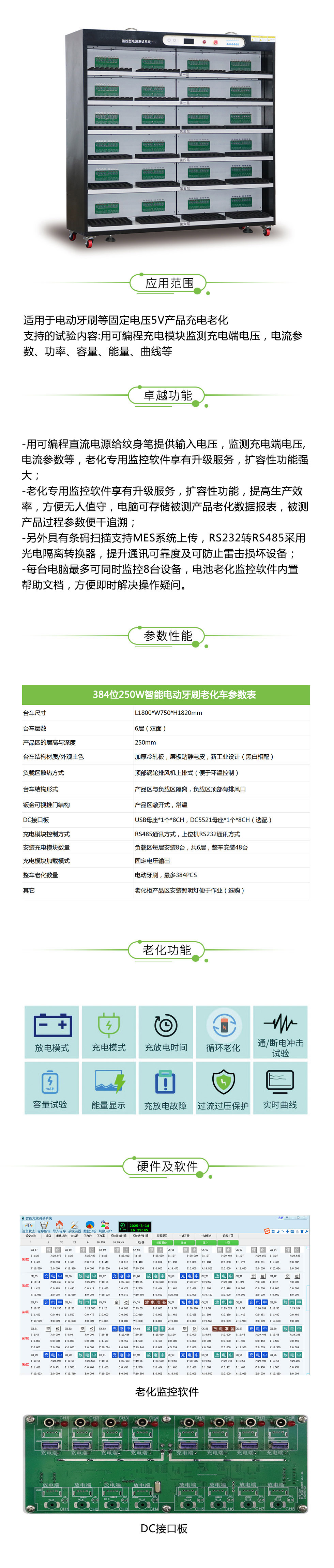 这是款型号为:ATS25250-Z-384的智能电动牙刷老化柜,适用于电动牙刷等固定电压5V产品充电老化,全隔离RS485通讯,老化数据可在软件界面直观展示,带有EMK,整车共六层,第四、五层为方便作业人员可手动灵活翻转,主控板上有电压显示器(AC)、报警器、急停以及模块电源控制,每个DC板位置配有工装以便固定产品,老化柜外观色系为外黑内白,支持非标定制。
