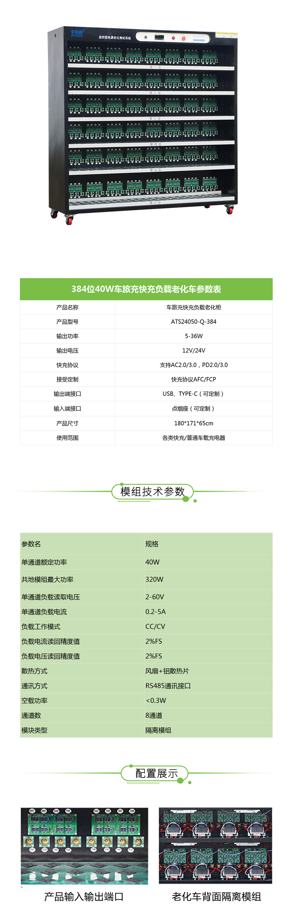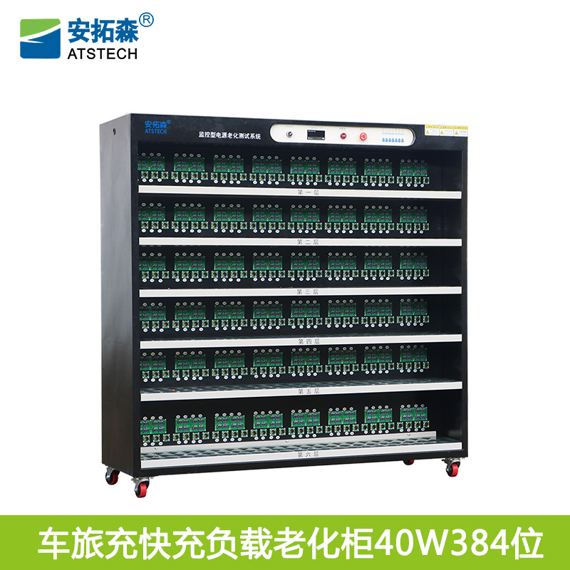这是款型号为:ATS24040-Q-384的车旅充快充负载老化柜老化柜,主要用于老化快充/普通车载充电器的产品,支持多种协议,老化数据可在软件界面直观展示,带有EMK,整车共六层,第四、五层为方便作业人员可手动灵活翻转,主控板上有USB输出电压选择、电压显示器(AC)、报警器、急停以及模块电源控制,外观主色系为黑色,支持非标定制。