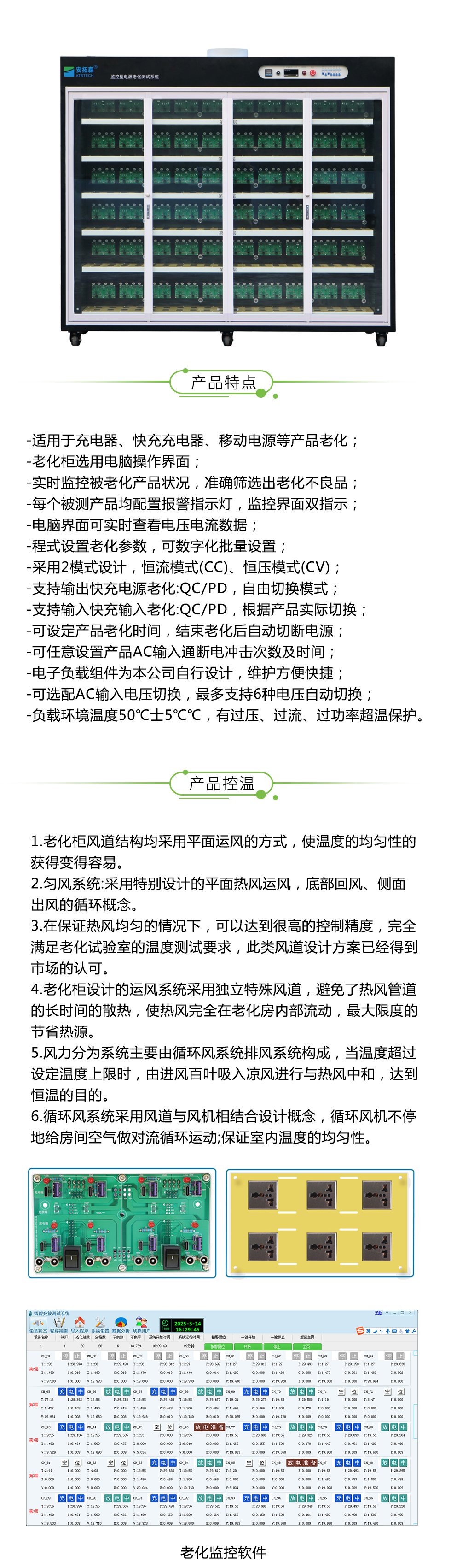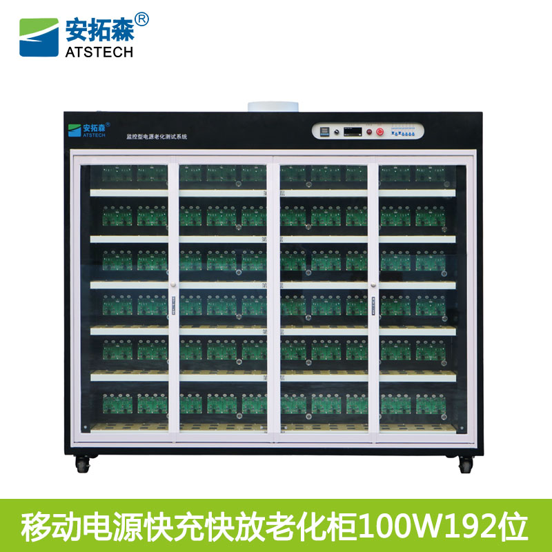 这是款型号为:ATS23100-Y-192的移动电源快充快放负载老化柜,主要用于老化充电器、快充充电器、移动电源等产品,具备恒温、快充快放、以及并联等功能特点,老化数据可在软件界面直观展示,带有EMK,整车一共六层,第四、五层为方便作业人员可手动灵活翻转,主控板上有AC输入电压切换旋钮、电压显示器(AC)、温控器、急停以及模块电源控制,外观主色系为黑色,支持非标定制。