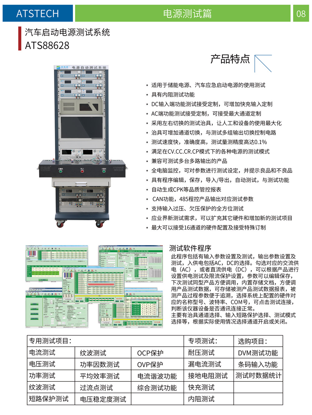 *CAN功能,485程控产品输出对应测试参数*支持输入过压、欠压保护的全方位测试,应业界新测试需求,可以扩充其它硬件和增加新的测试项目*最大可以接受16通道的硬件配置及接受特殊订制