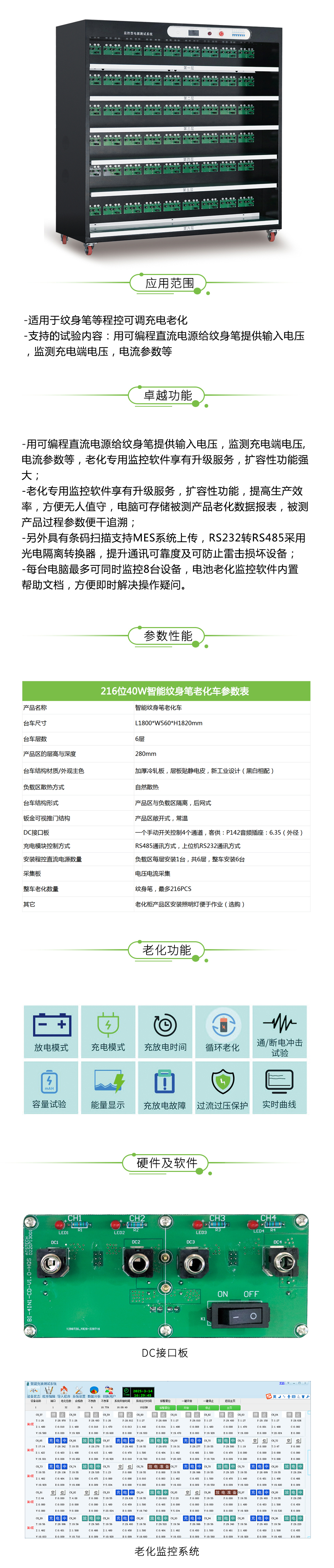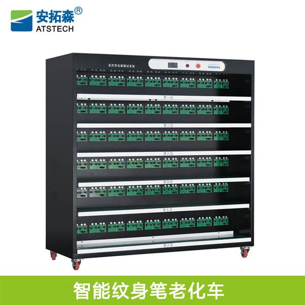 这款负载抽风型电源老化车,型号为:ATS21000-A-216,适用于老化:纹身笔产品,整车共六层,第四、五层为方便作业人员可手动灵活翻转,主控板上有电压显示器(AC)、报警器、急停以及模块电源控制,数据监控方式为电脑软件系统,支持EMS系统,老化柜外观主色系为黑色,支持非标定制。
