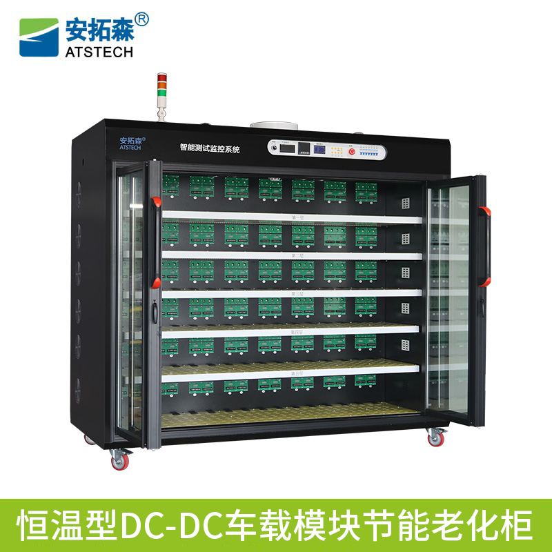 这是款型号为:ATS28350-J-H-96的恒温型DC-DC车载模块节能老化柜,主要用于老化电源模块类产品,支持恒温以及节能等功能特点,老化数据可在软件界面直观展示,整车一共六层,第四、五层为方便作业人员可手动灵活翻转,主控板上有照明开关、、电压显示器(AC)、数字电表(显示节能回馈)温控显示屏,急停以及模块电源控制,外观主色系为黑色,支持非标定制。