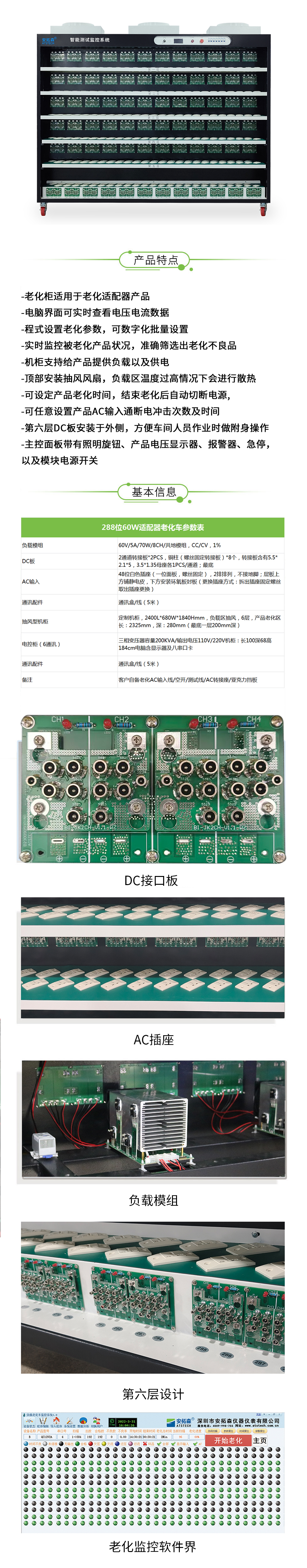 这是款型号为:ATS21060-E-288的适配器老化柜,是一款抽风型型老化柜,有288通道,单通道可老化60W,主控板上有照明开关、电压显示器(AC)、报警器、急停以及模块电源控制,外观主色系为黑色,支持非标定制。