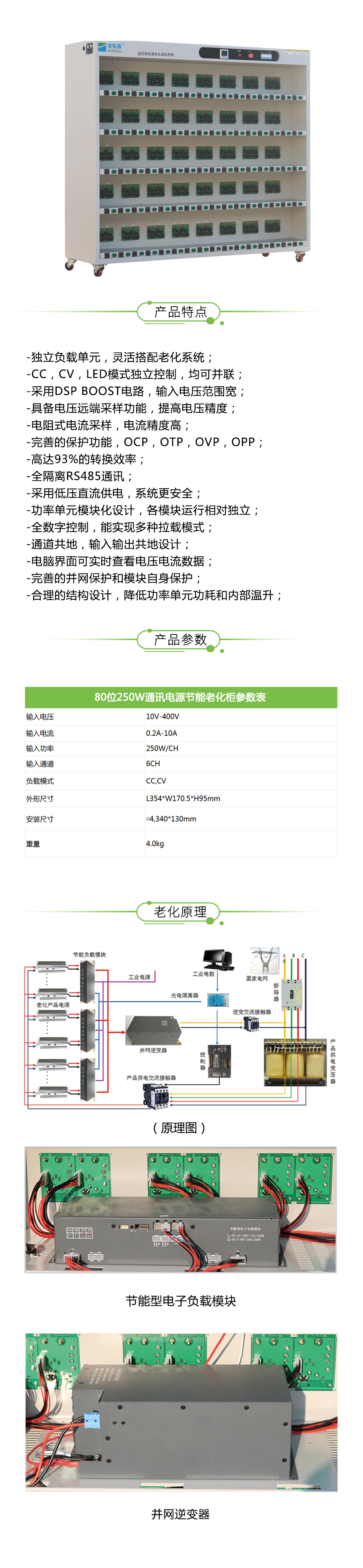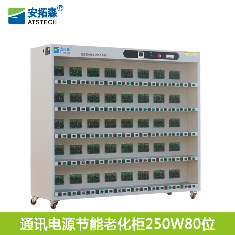 这是款型号为:ATS28250-Z-80的通讯电源节能老化柜,主要用于老化通讯电源类产品,具备恒流与恒压模式,模块供电处在不同系统,有利于抗干扰(串电压击穿主芯片等),老化柜采用了节能,可节省至80%,老化数据可在软件界面直观展示,整车一共四层,主控板上有电压显示器(AC)、报警器、急停以及模块电源控制,外观主色系为白色,支持非标定制。