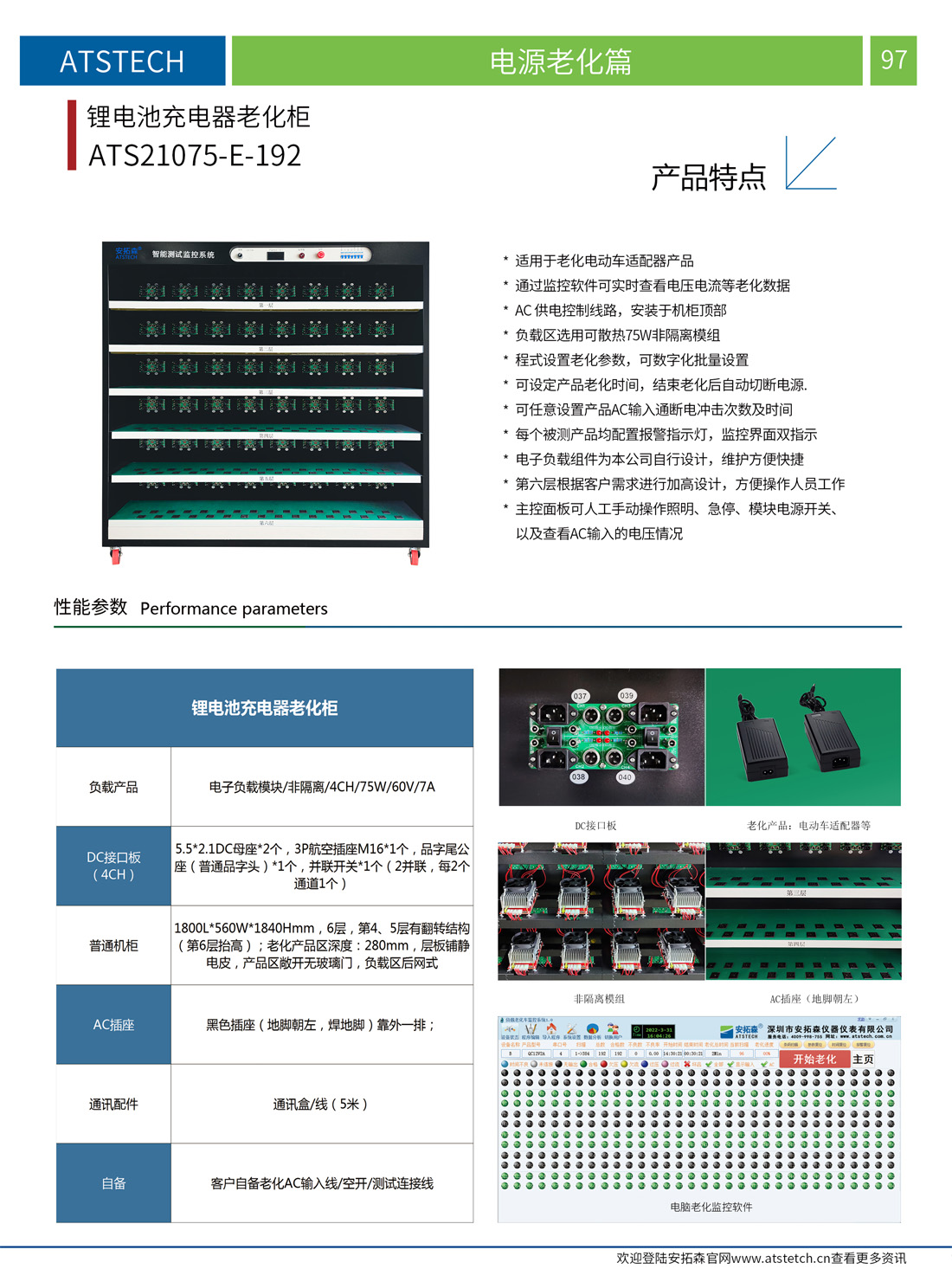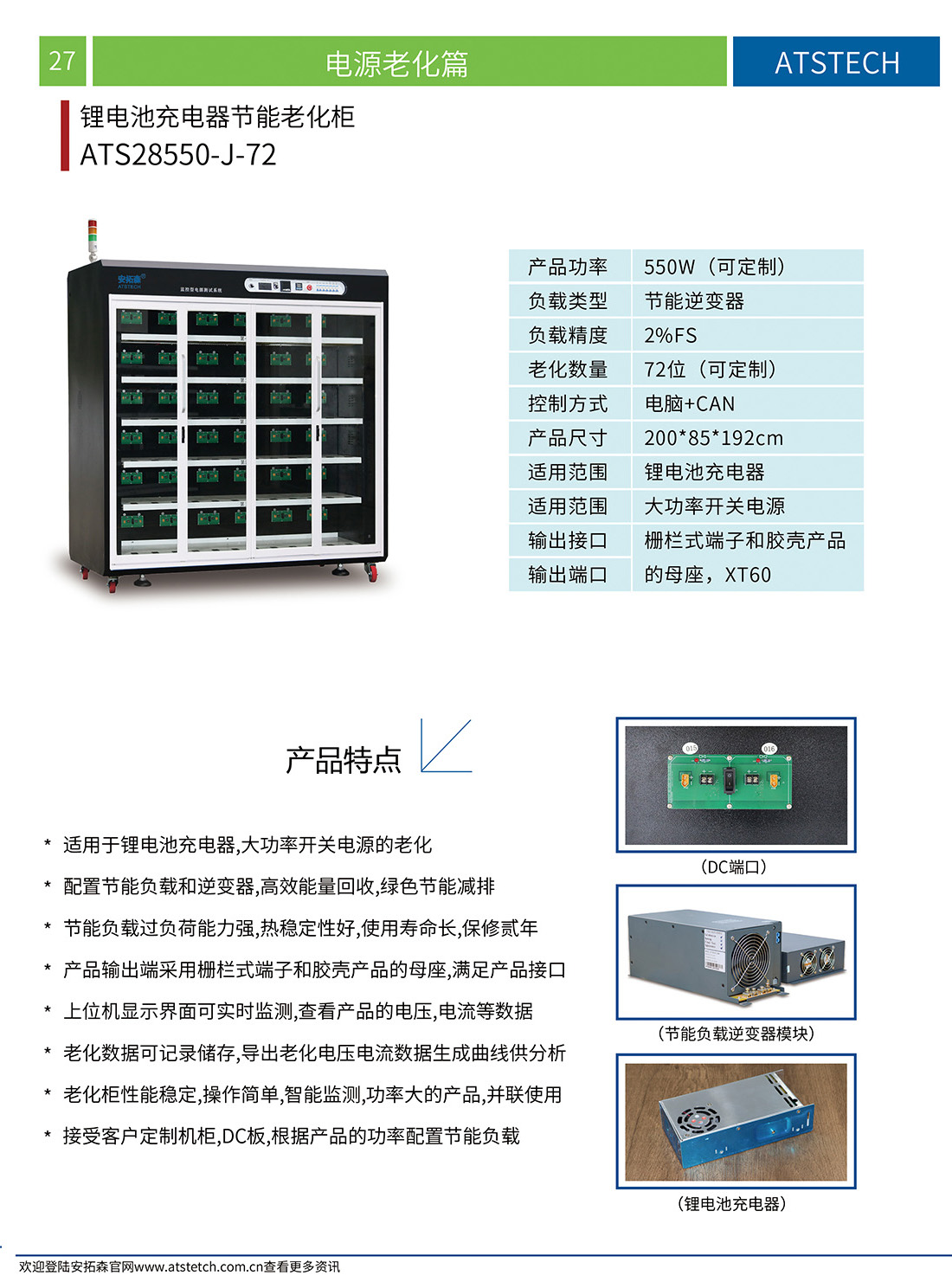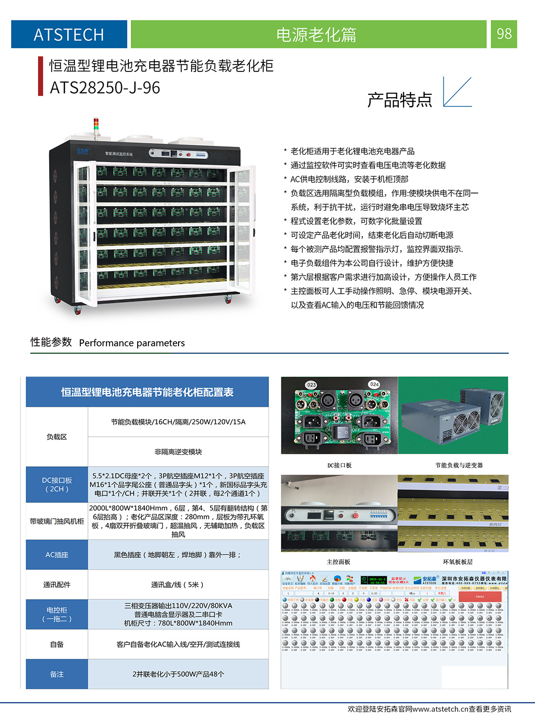 (二)上方老化测试设备的型号为ATS28250-J-96,产品名称:恒温型锂电池充电器节能负载老化柜, 可老化测试250W96通道,负载电压120V电流15A,温控最高50℃,节能回馈80%,是根据客户需求以及产品规格参数进行定制。